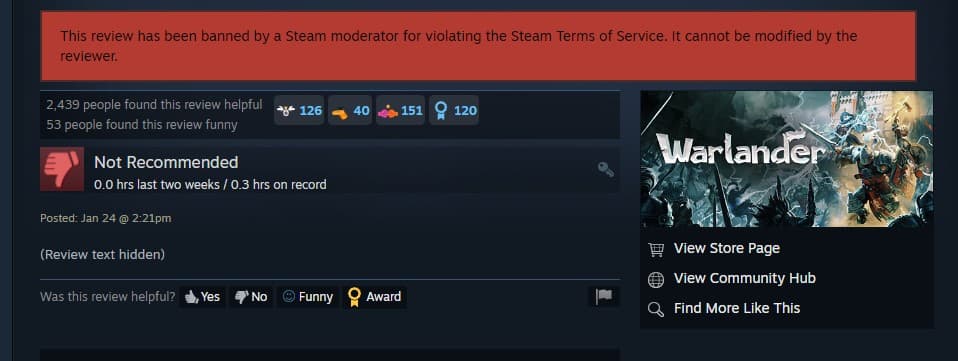 Система модерации Steam забанила этот отзыв о Warlander и тех, кто его поддержал. В ходе общения с поддержкой Steam удалось снять несправедливое наказание.