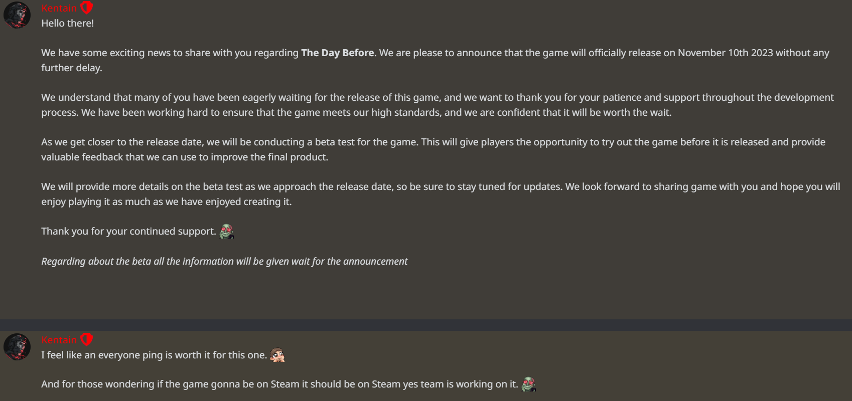 Утверждают, что The Day Before выпустят 10 ноября 2023 года, в этот раз без переносов. Также отметили, что работают над возвращением игры в Steam (её удалили, когда возникли вопросы к названию).