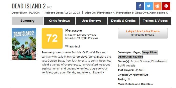 Сегодня спало эмбарго на публикацию рецензий на Dead Island 2. Сейчас средний бал зомби-песочницы на агрегаторе Metacritic составляет 72 из 100 и 73 из 100 на OpenCritic.