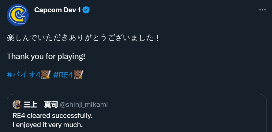Capcom обратила внимание пост Синдзи Миками в социальной сети. Разработчики решили поблагодарить его за игру в ремейк Resident Evil 4.