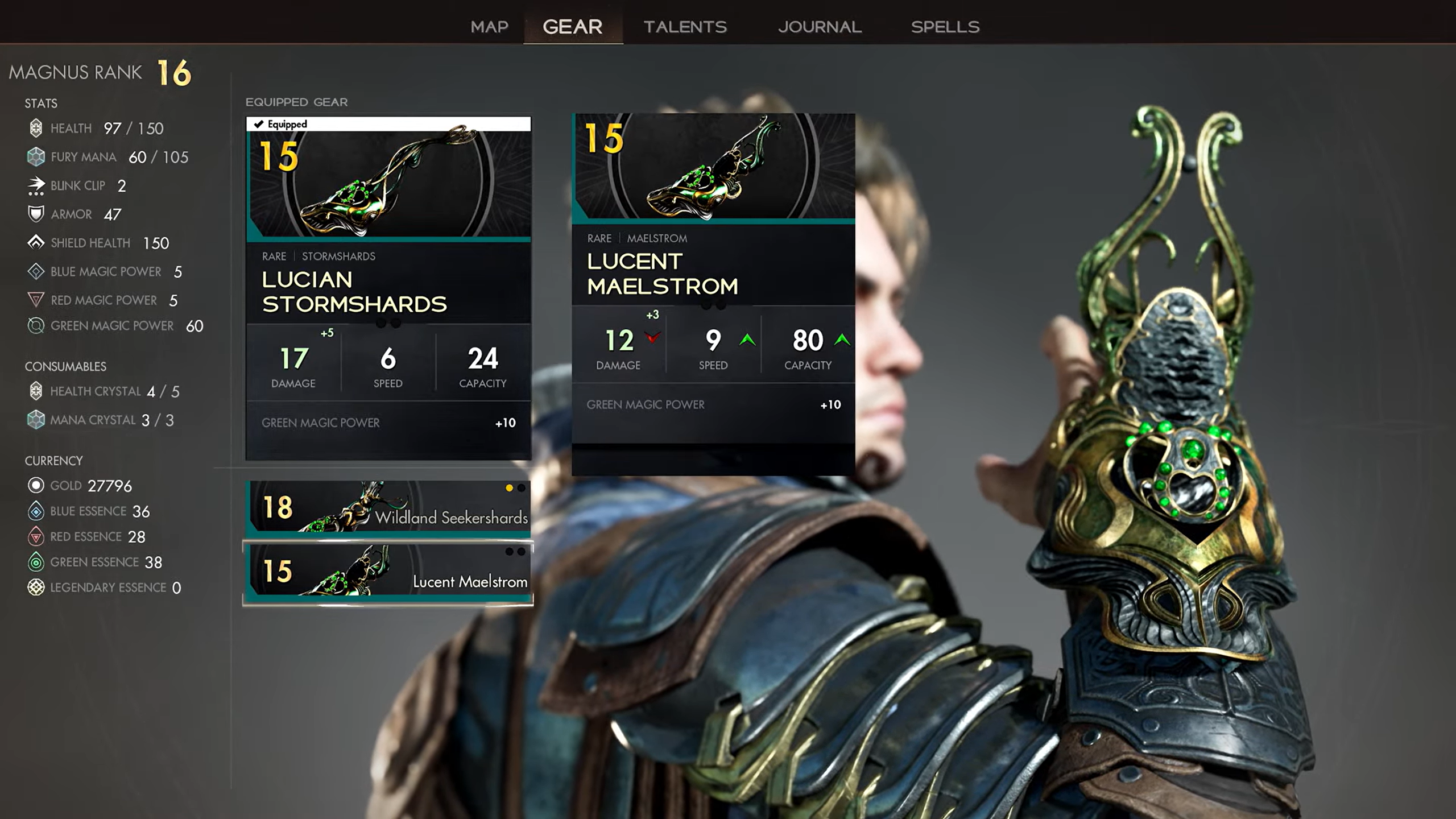 Главный герой ведёт стрельбу заклинаниями, использует заклинание-хлыст и выставляет щит. Также показывают небольшую загадку и снаряжение с массой характеристик.