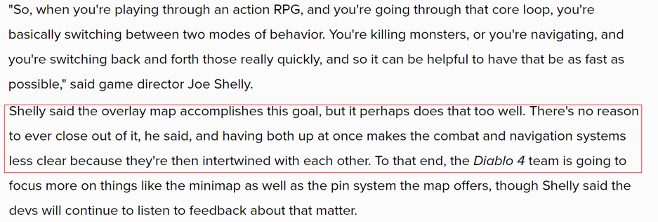 На трансляции высказался руководитель разработки Diablo 4 Джо Шелли (Joe Shelly). Если коротко, то карту-оверлей решили не добавлять, поскольку игроки будут её использовать.