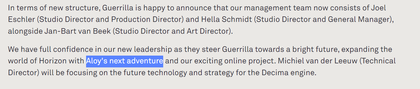Внимание сообщества Horizon привлёк фрагмент заявления, в котором упоминается следующее приключение Элой. Работа над онлайн-проектом по франшизе Horizon тоже продолжится.