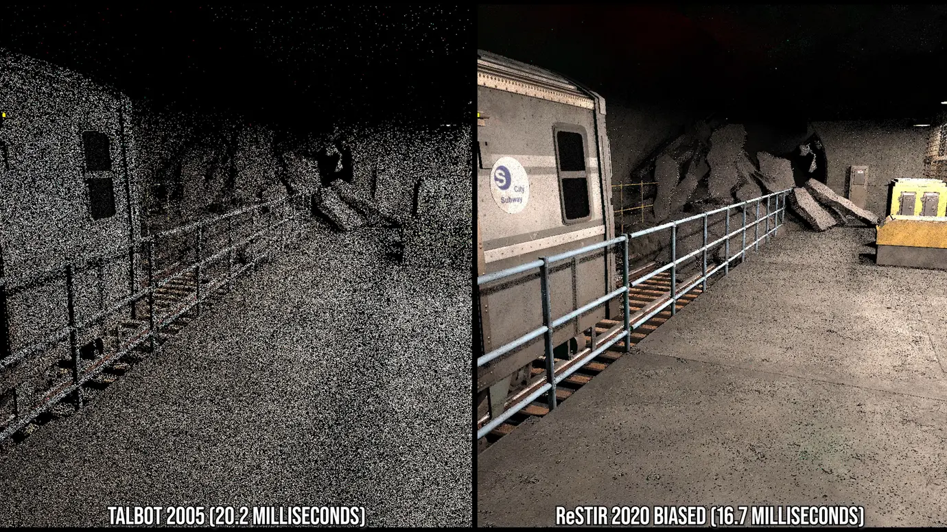 За минувшие 4 года улучшилось не только аппаратное, но и программное обеспечение. Например, упомянули об алгоритме ReStir (Spatiotemporal Reservoir Resampling): используется информация о лучах из предыдущих кадров — в результате меньше шума и при этом работает быстрее. Также добились успехов в реконструкции изображений (появилась технология DLSS).