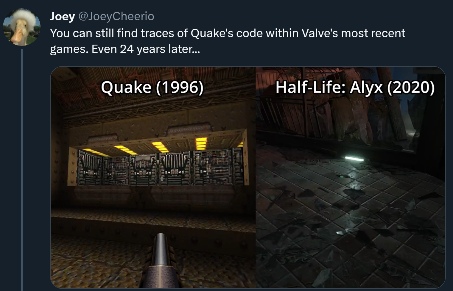 JoeyCheerio отметил, что это решение чуть старше. Он показал, что такое мерцание света представили раньше в легендарном шутере Quake (1996 год). Получается, что спустя 24 года в играх Valve живёт частичка первой Quake.