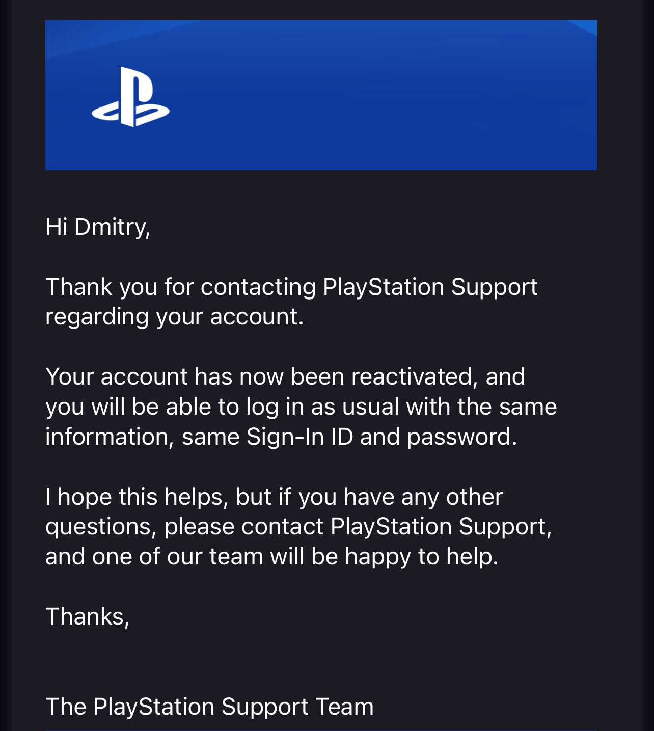 Dmitry P рассказал, как ему это удалось: «…нашел почту Службы поддержки (destek@tr.playstation.com). В итоге написал им и в российский сегмент». Поскольку у него турецкий аккаунт, то поддержка отослала его в турецкий сегмент и предоставила необходимые контакты.