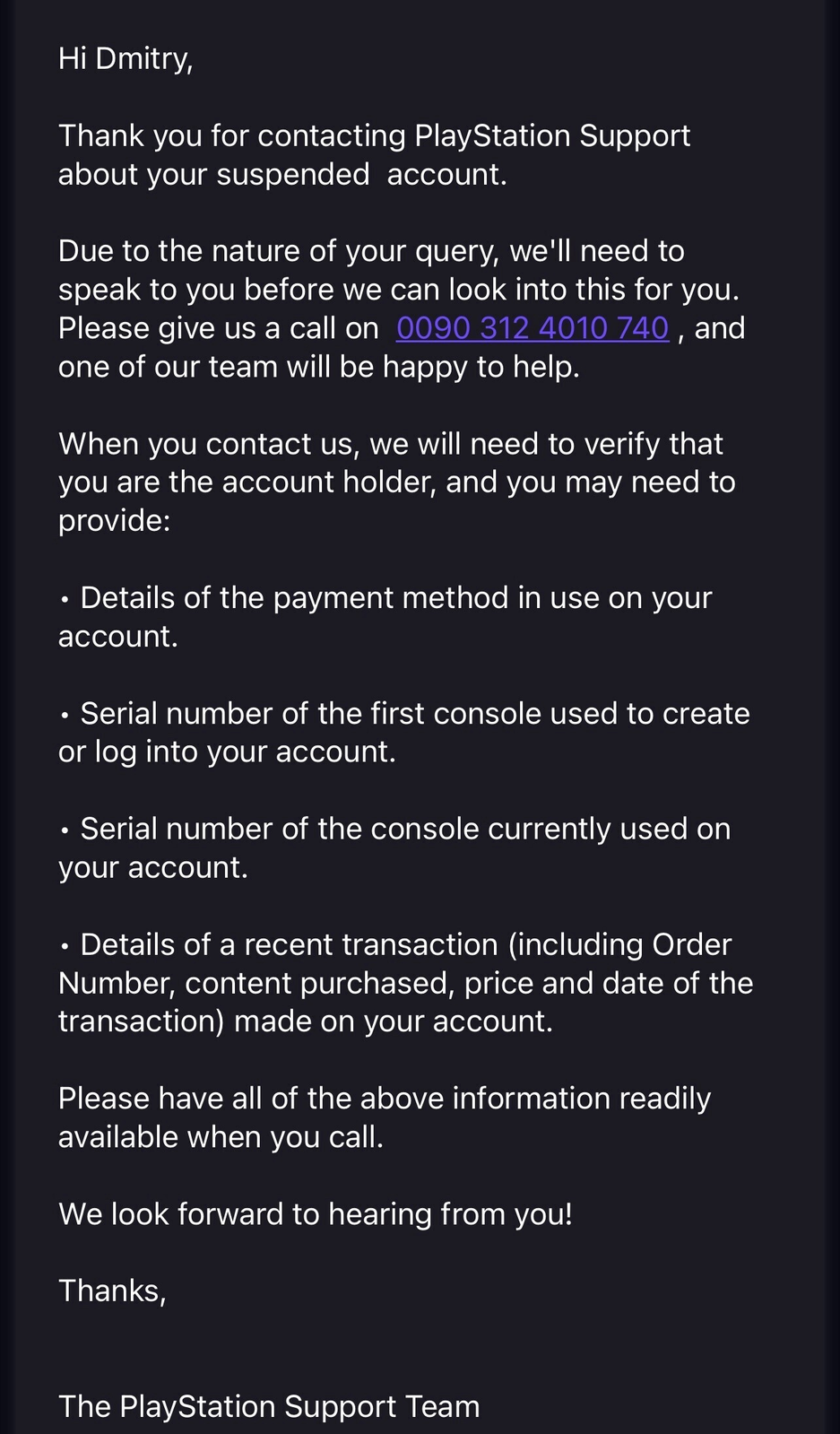 Он связался и получил ответ от турецкой поддержки: надо позвонить на горячую линию; требуется информация для идентификации, например номер карты, серийный номер консоли и т.д: