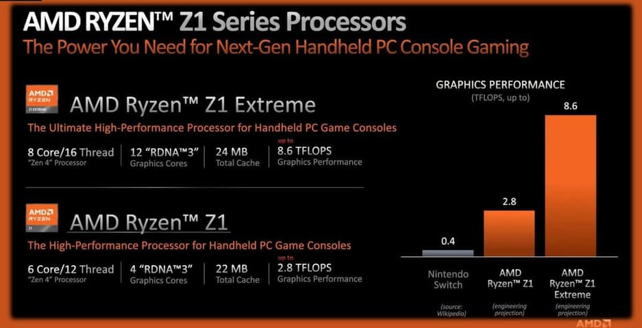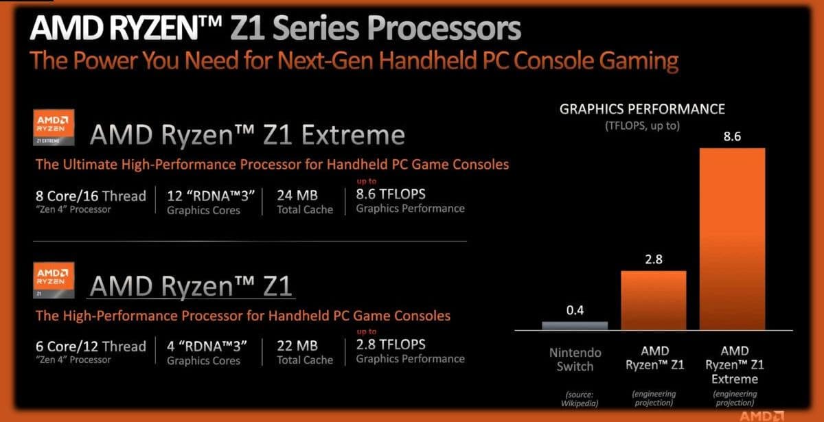 Серия Z1 состоит из двух процессоров: базового Z1 и версии Extreme. Первый оснащен 6 ядрами и 12 потоками и 22 МБ кэш-памяти. За формирование графики отвечают четыре вычислительных блока на базе архитектуры RDNA 3.