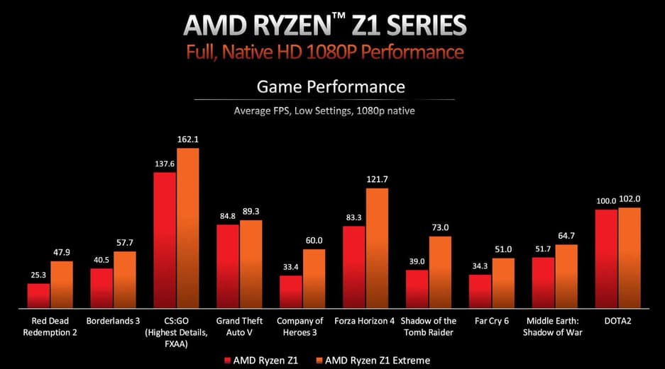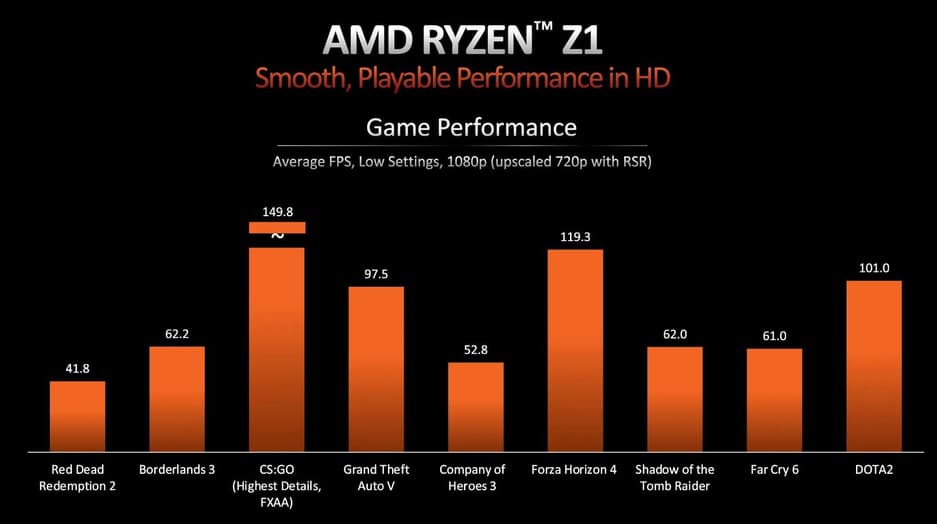 Как видно из графика, менее производительная версия процессора Z1 не может достичь 60 кадров в секунду в большинстве протестированных игр. Но AMD нашла решение, включив технологию RSR (Radeon Super Resolution), которая масштабирует изображение с 720p до 1080p. Это позволит пользователям консолей с менее производительным процессором наслаждаться игровым процессом с частотой 60 кадров в секунду.