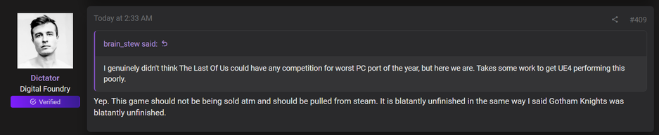 Специалист Digital Foundry Алекс Батталия (Alexander Battaglia) высказал авторитетное мнение: «.…[Star Wars Jedi Survivor] не должна продаваться сейчас в Steam. Она откровенно незакончена так же, как была откровенно незакончена Gotham Knights».