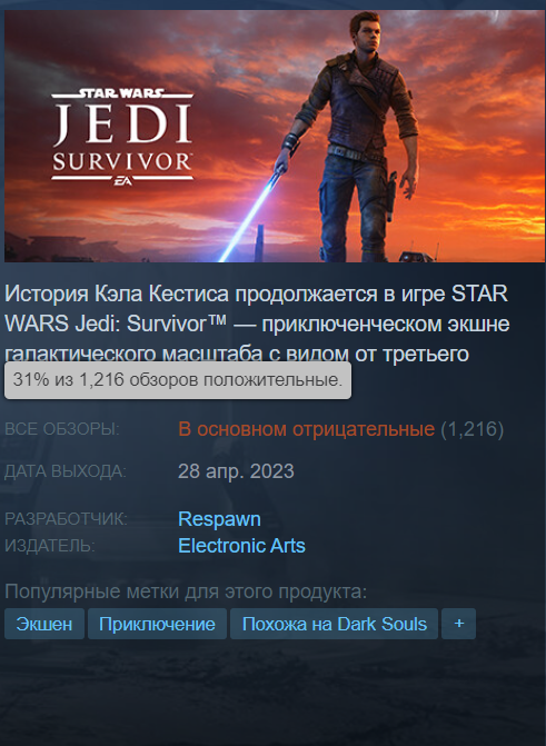 Star Wars Jedi Survivor старту в основном с отрицательных обзоров в Steam. Виной тому не только отсутствие русской локализации (ранее находили её упоминание), но и ужасное техническое состояние.