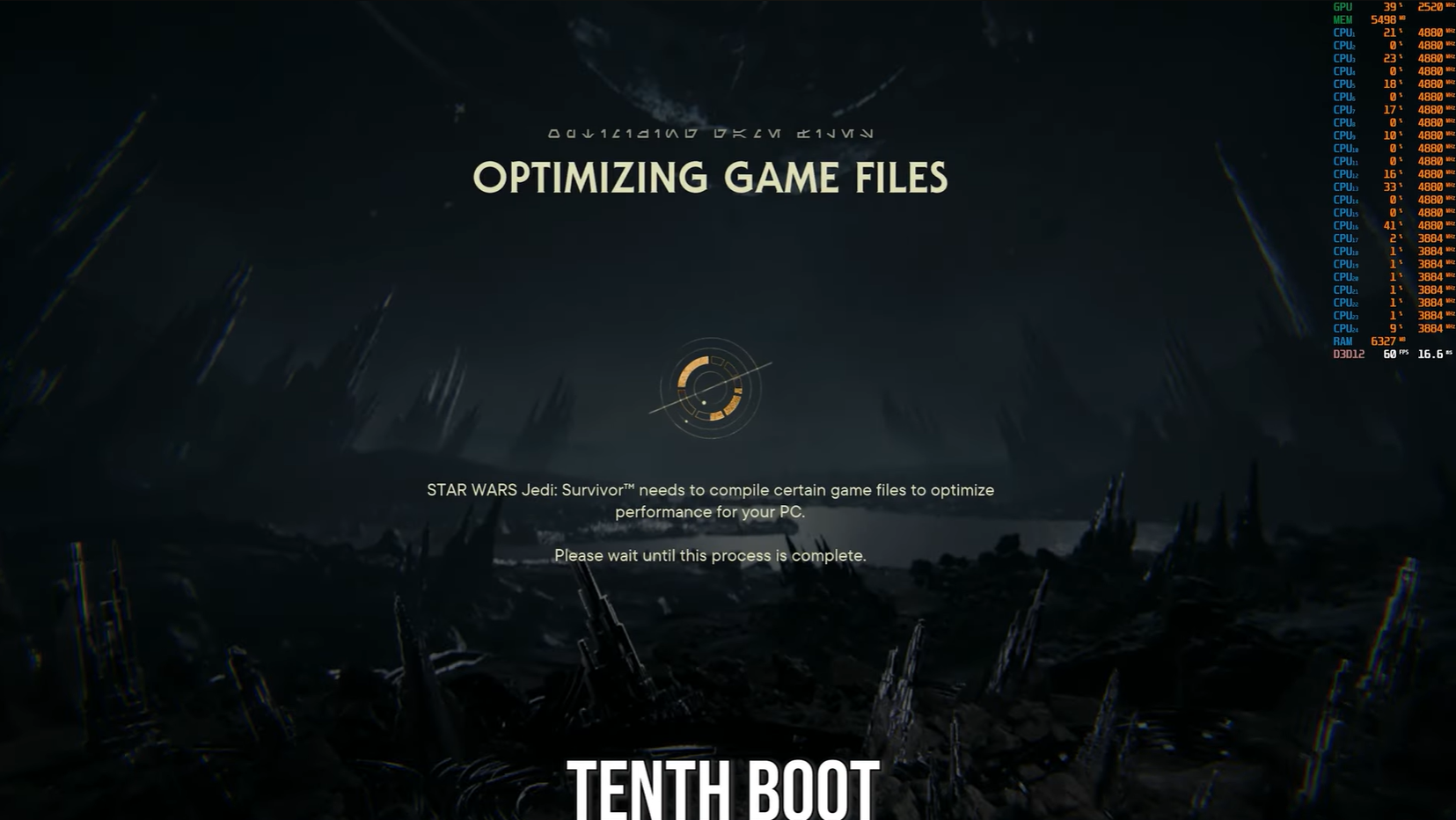 Проблемы со Star Wars Jedi Survivor начинаются на этапе запуска. Пишут об оптимизации файлов, при этом такое происходит при каждом запуске. Есть сомнения, что во время появления такого уведомления вообще что-то происходит, поскольку нагрузки на процессор практически нет.