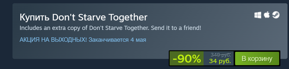 Don't Starve Together получила в Steam скидку 90%, т.е. до 4 мая можно купить игру за 34 рубля и получить в подарок ещё одну копию игры.