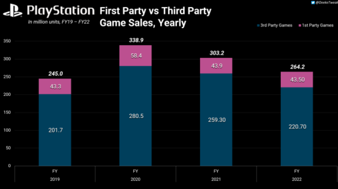 Если присмотреться к Activision, то можно тоже заметить подобную тенденцию. Call of Duty Modern Warfare 2 заработала миллиард долларов за 10 дней. При этом в 3 квартале 2022 года, когда выпустили CoD MW2, на PlayStation всего продали 86.5 миллиона игр, из которых 65.7 миллиона — игры сторонних студий.