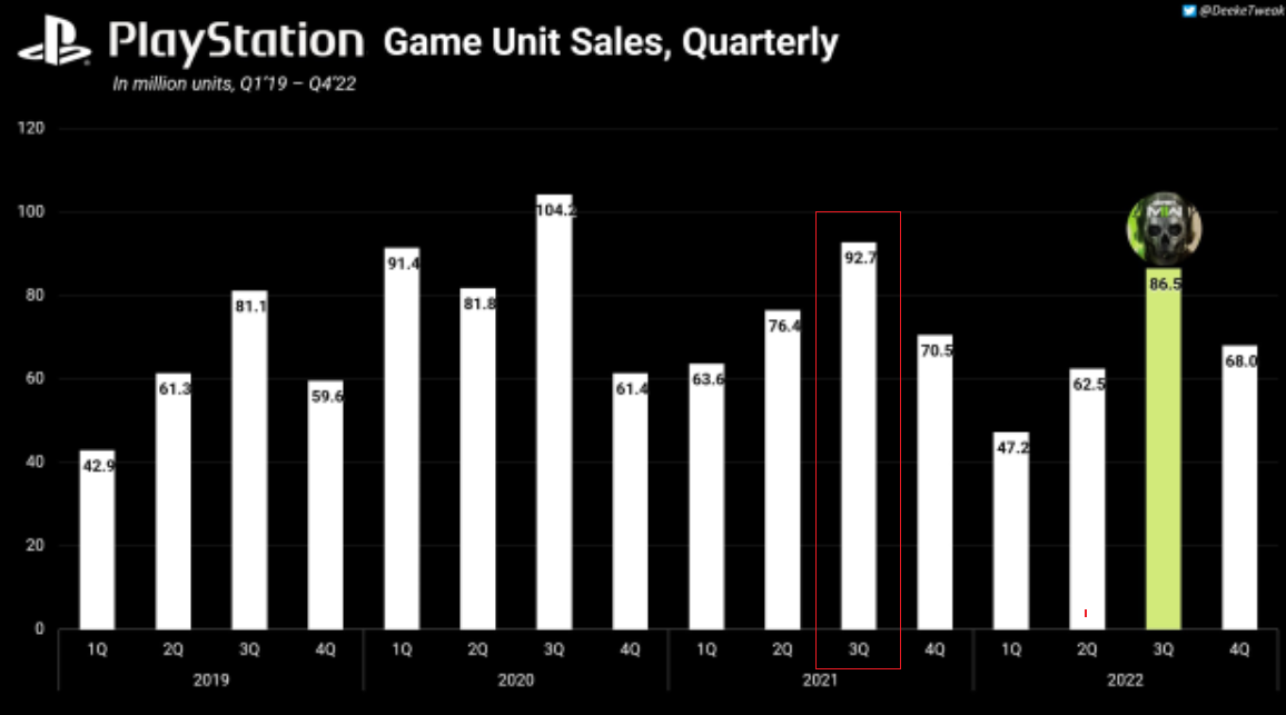 Для сравнения, в 3 квартале 2021 года всего продали 92.7 миллиона копий игр. Выглядит так, что такой доходный крупный релиз как CoD MW 2 кардинально не повлиял на общие продажи (CoD очень популярна на PlayStation).