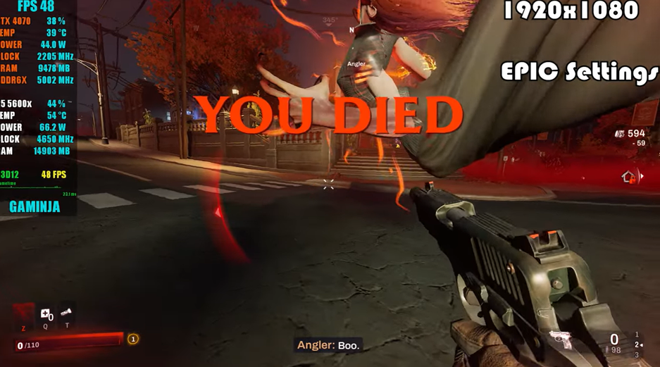 В ролике GAMINJA враги подвисают. Например, вот такое случилось на 1:53. Модель врага зависает, издаёт звуки, а герой падает. Redfall сообщает: YOU DIED.
