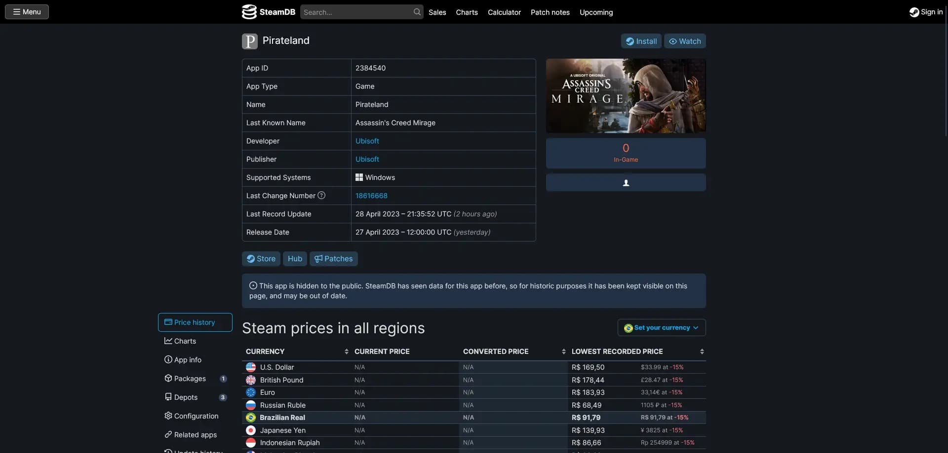 Товар Steam App ID 2384540 сначала представлялся как Assassin's Creed Mirage, но затем поменял название, описание и изображения на Pirateland.
