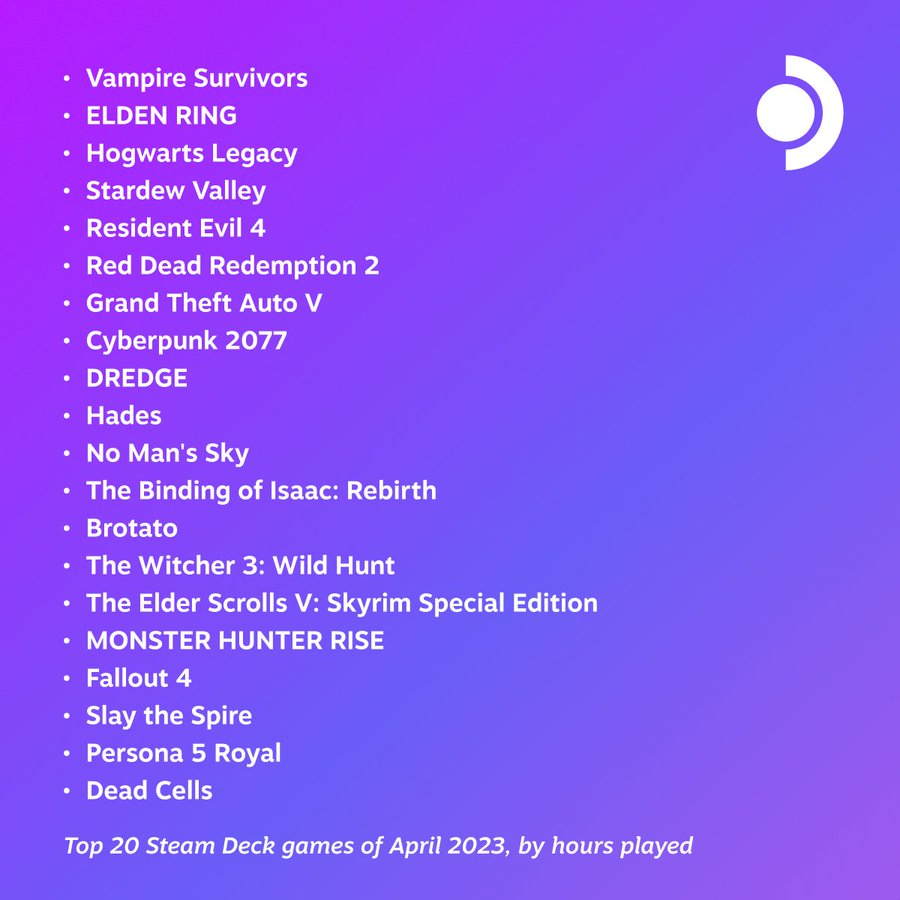 Vampire Survivors вновь на первом месте, а следом идёт Elden Ring и Hogwarts Legacy. По-прежнему сохраняется интерес к Red Dead Redemption 2, GTA 5, Cyberpunk 2077, TES V Skyrim.