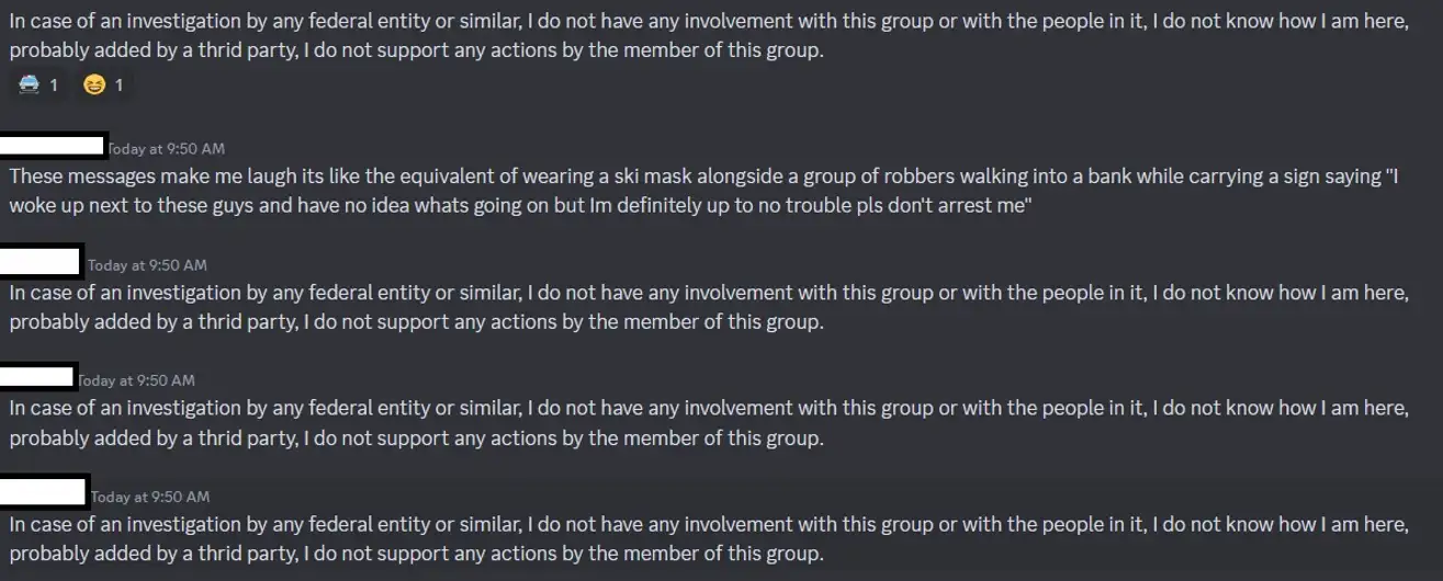 Также встречаются сообщения, адресованные потенциальным следователям: «В случае расследования со стороны какой-либо федеральной структуры или чего-то подобного, я не имею никакого отношения к этой группе [Discord] или к людям в ней, я не знаю, как я здесь оказался, возможно, добавлен третьей стороной, я не поддерживаю никаких действий членов этой группы [имеется ввиду публикация спойлеров / ссылок на загрузку образа Zelda]».
