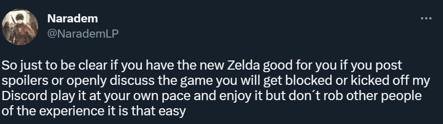 Некоторые администраторы начали запрещать публиковать спойлеры или вообще обсуждать The Legend of Zelda Tears of the Kingdom, чтобы не навлечь на себя беду. Грозят блокировками / изгнанием из канала Discord.