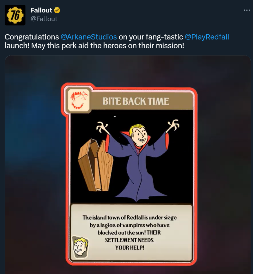 Коллеги из Bethesda поздравили Arkane Austin с релизом Redfall. Учитывая обстоятельства запуска и тот факт, что поздравление отправил аккаунт Fallout с логотипом 76 (на релизе Fallout 76 была в ужаснейшем техническом состоянии) происходящее воспринимается сообществом как троллинг.