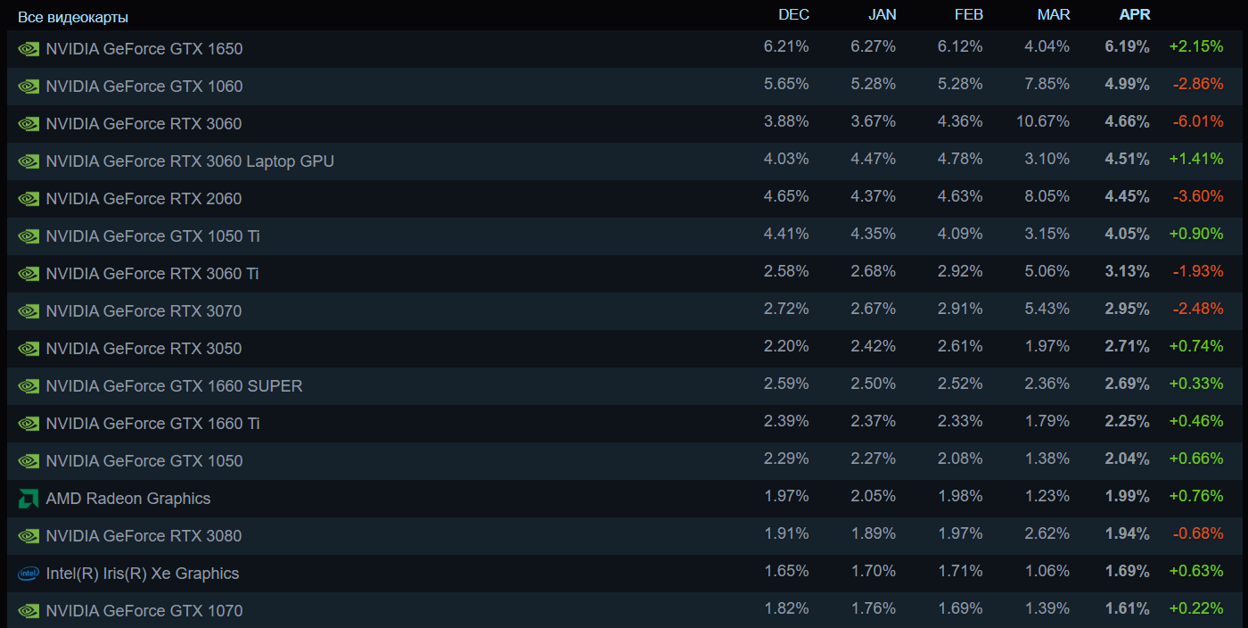 GeForce GTX 1650 вновь стала популярнейшей видеокартой Steam, следом идёт GeForce GTX 1060, а замыкает тройку лидеров GeForce RTX 3060.
