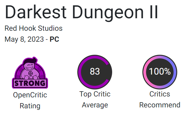 Darkest Dungeon 2 получила на OpenCritic 83 балла, 100% критиков рекомендуют познакомиться с игрой.