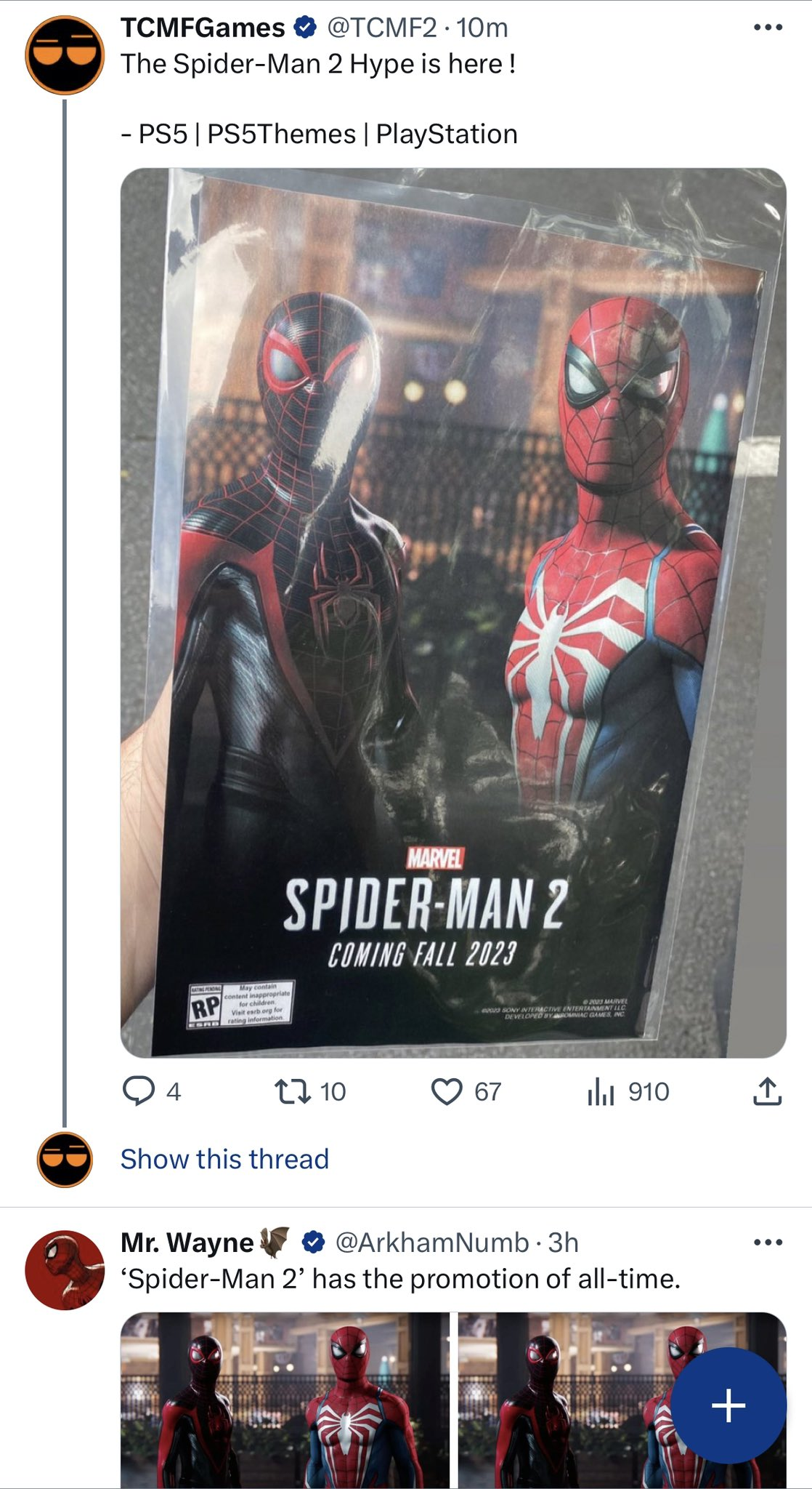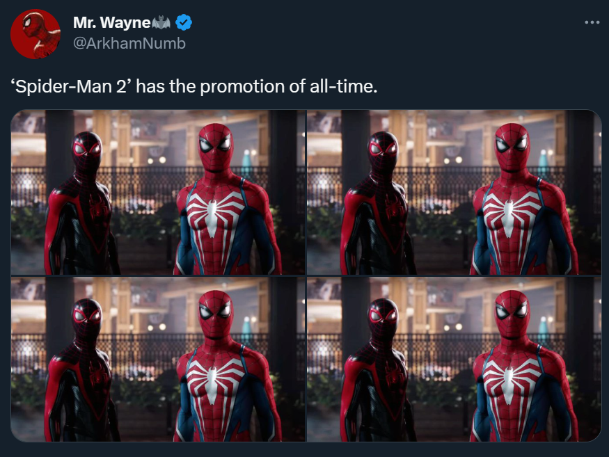 ArkhamNumb опубликовал коллаж, который передаёт ощущение фанатов от маркетинговой кампании Marvel's Spider-Man 2. Так получилось, что чаще всего в материалах об игре используют одну картинку — два Человека Паука (Питер Паркер и Майлз Моралес) смотрят в камеру.