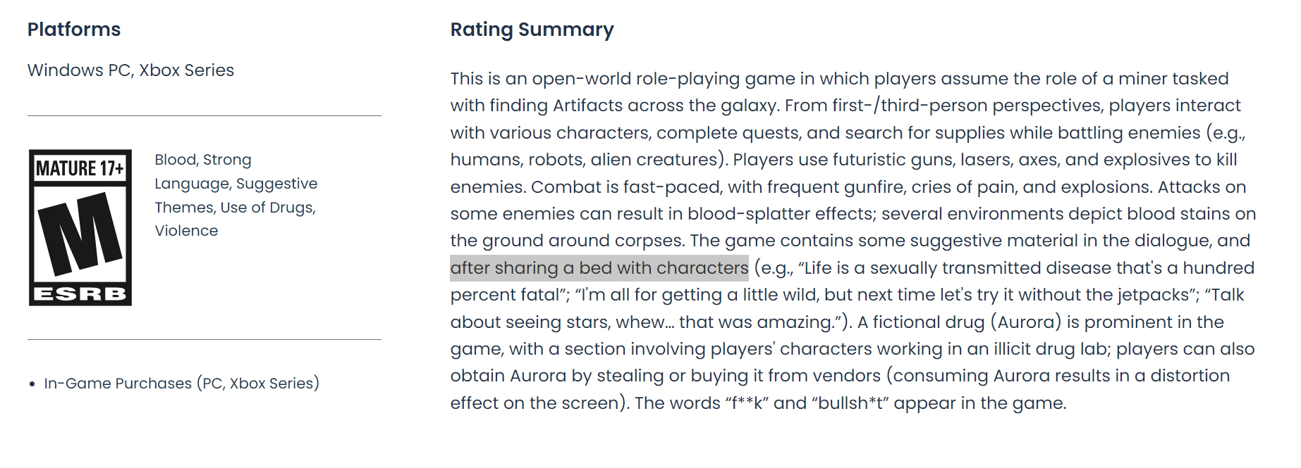 Тогда Starfield ещё нельзя было найти в базе ESRB. Теперь страницу отыскали, в описании встречается интригующий фрагмент.
