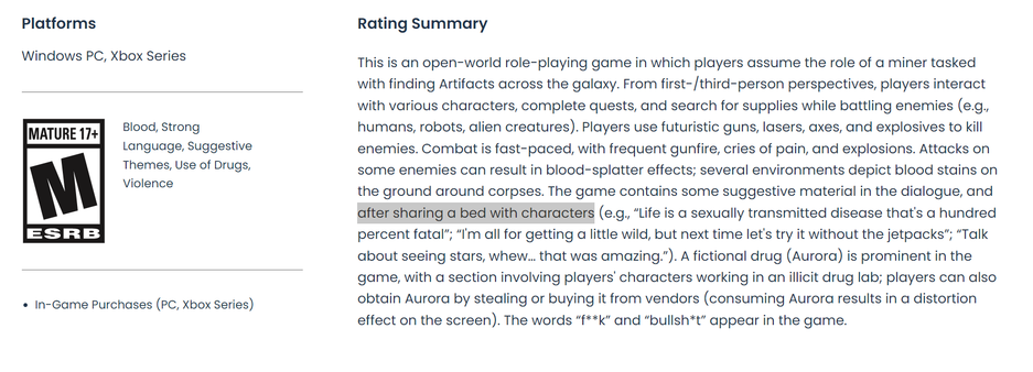Недавно фанаты Bethesda заметили, что в профиле Starfield появилась отметка о рейтинге ESRB. Игре присвоили рейтинг M (для взрослых).