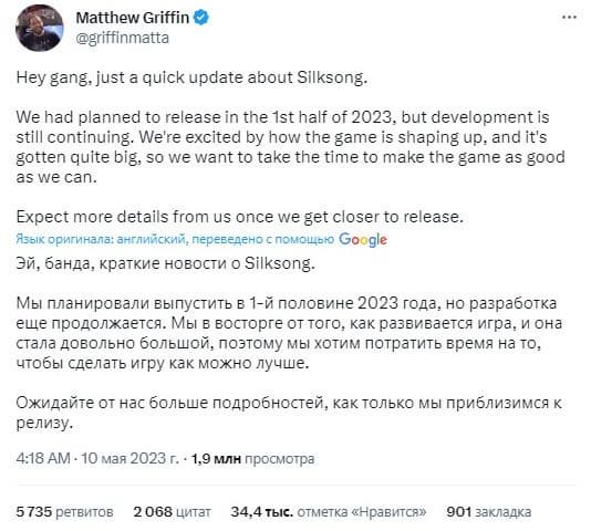 Студия Team Cherry анонсировала Silksong в феврале 2019 года. Сегодня в Twitter появилось сообщение от Мэтью Гриффина, ответственного за маркетинг и издание игры.