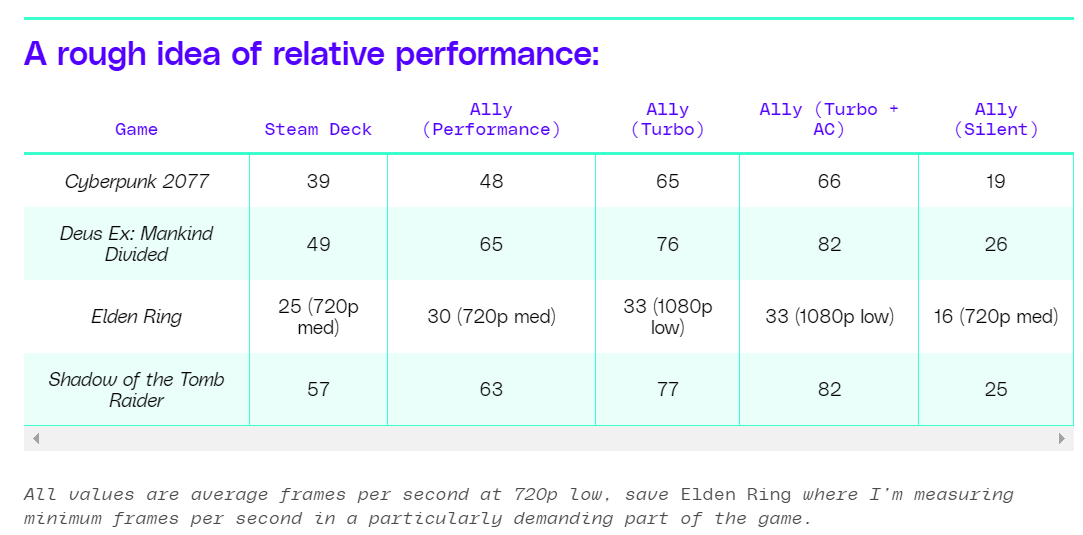 Сравнение производительности ASUS ROG Ally и Steam Deck. У Ally есть турбо-режим: энергопотребление повышается, зато устройство работает значительно эффективнее. Например, в Turbo можно получить 60+ FPS в Cyberpunk 2077.