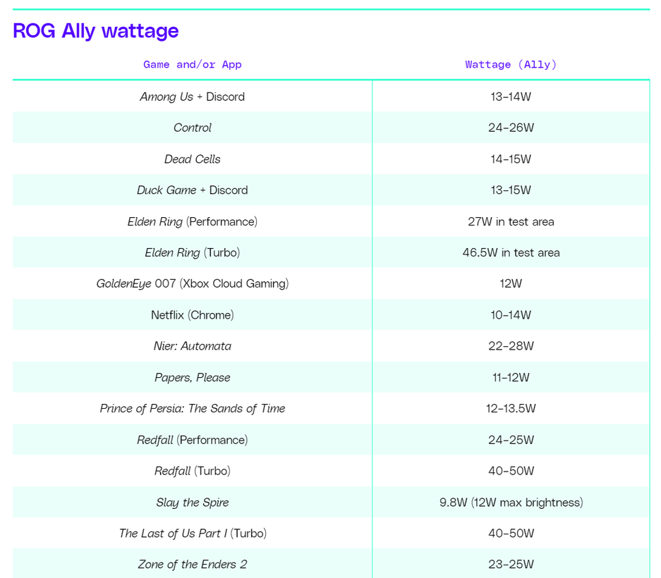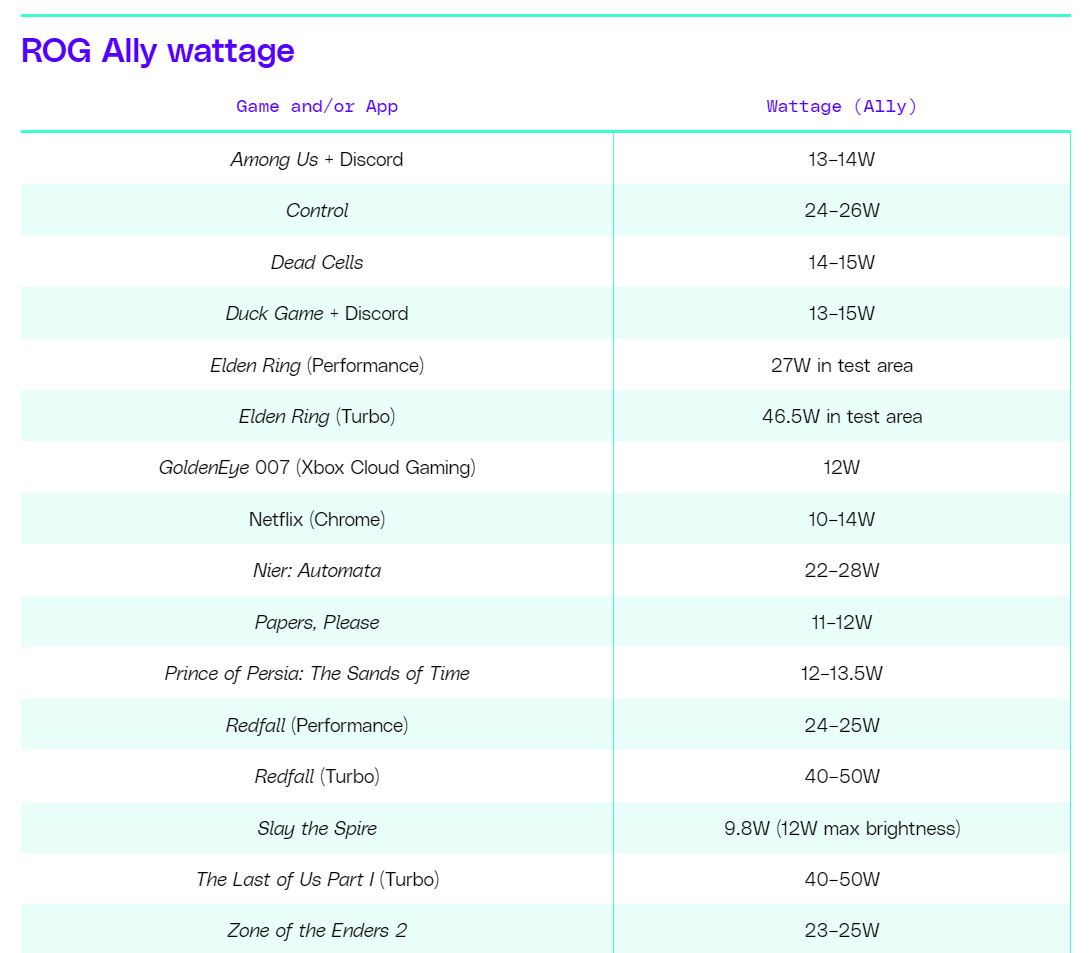 Таблица энергопотребления ASUS ROG Ally в разных играх.