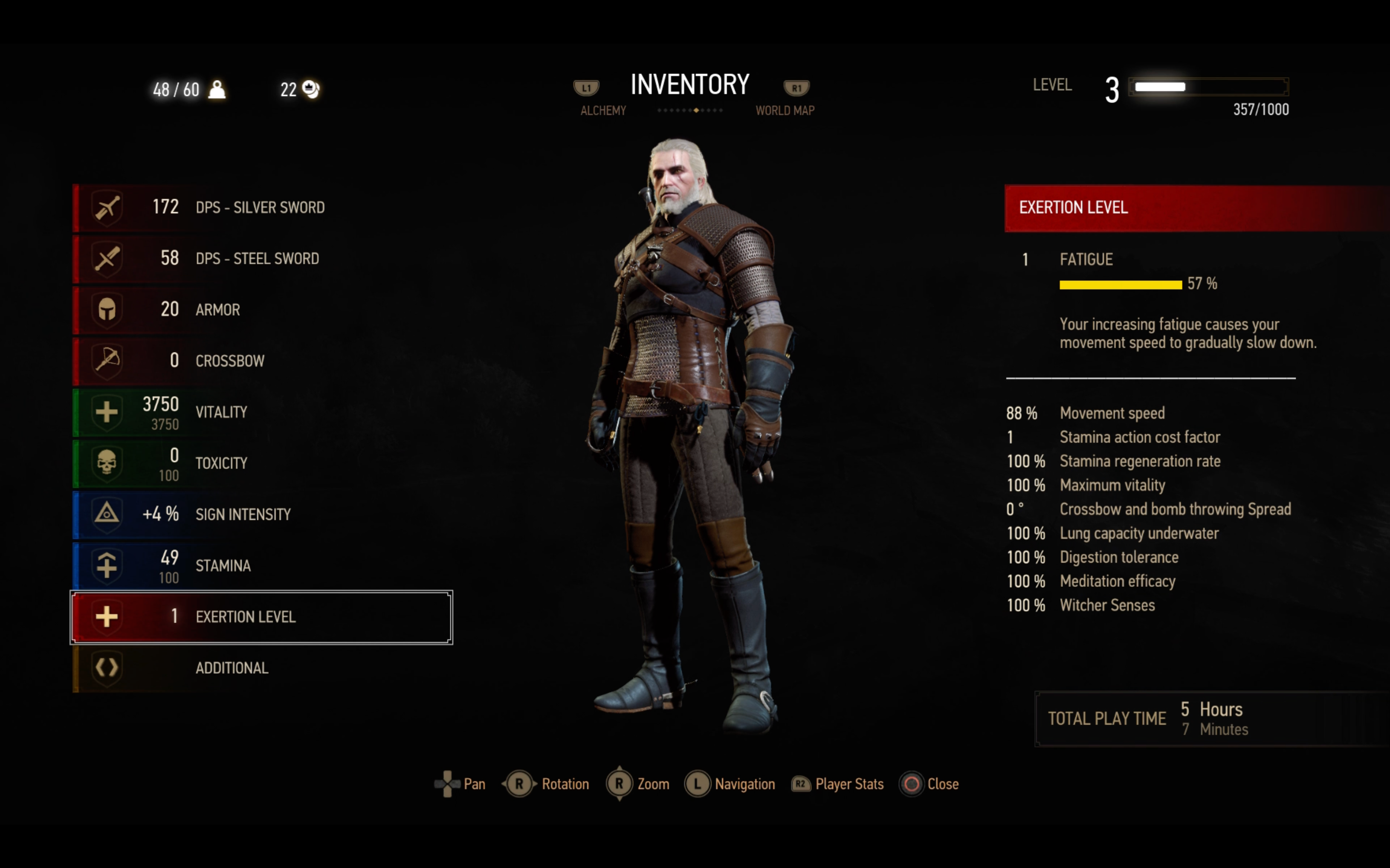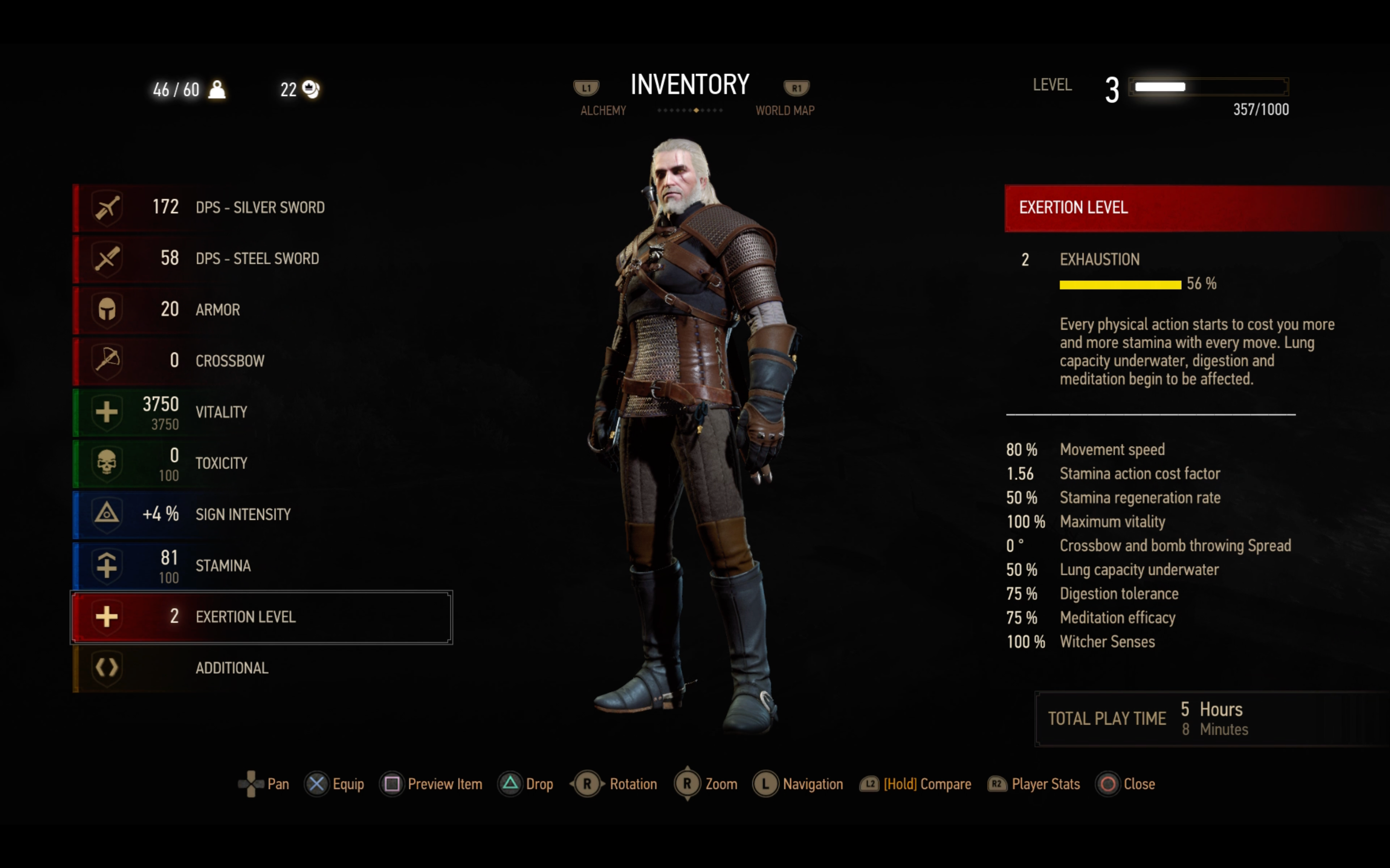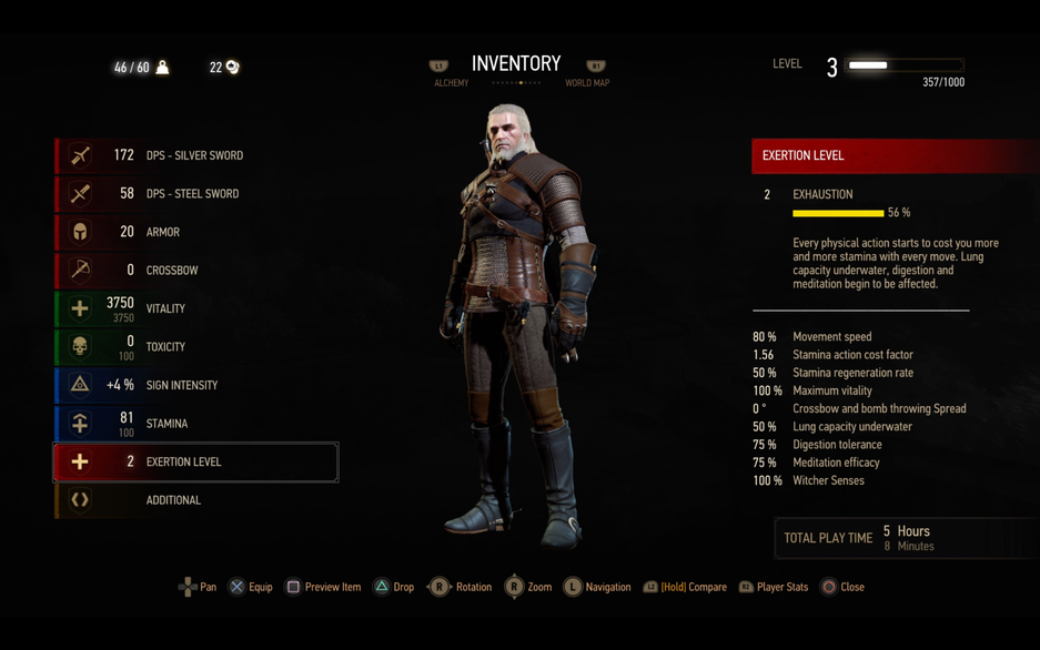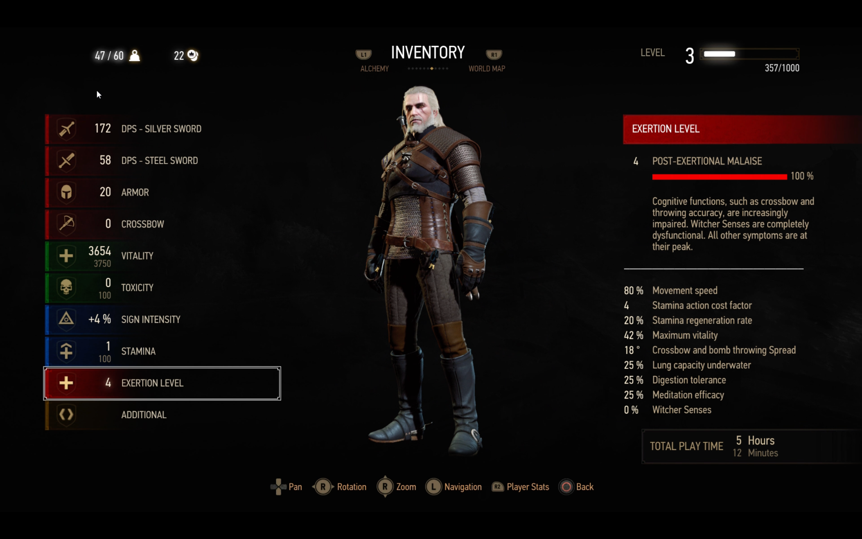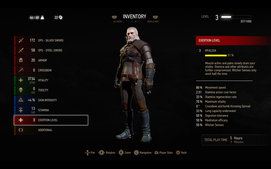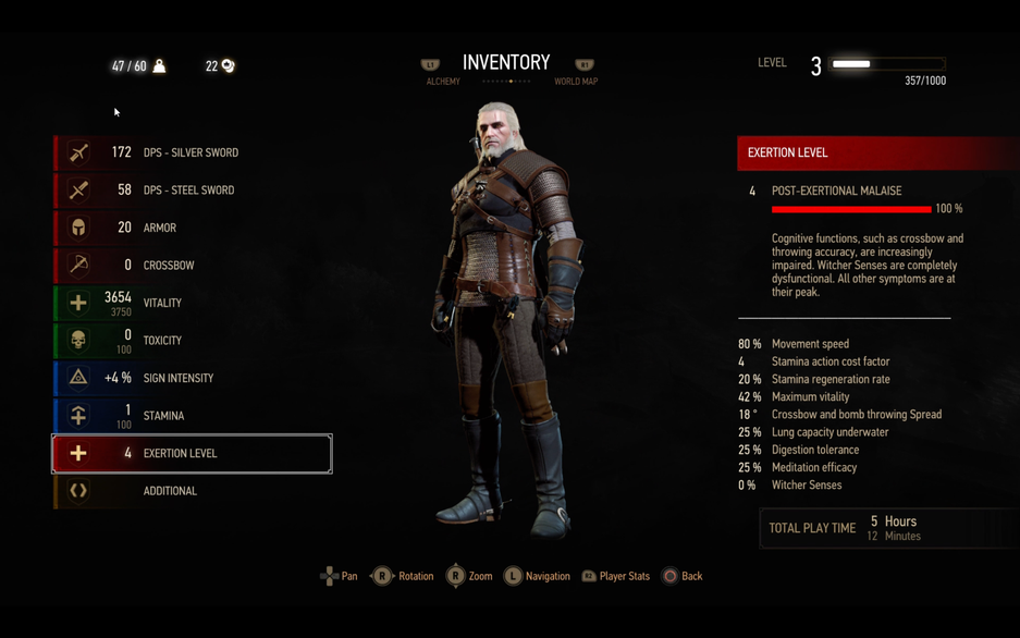 С каждой стадией сложнее будет задерживать дыхание под водой (при PEM расход в 4 раза быстрее). Если потратить всю выносливость, то игра «накажет» вспышкой яркого света (на более поздних стадиях их будет несколько) и оглушит Геральта на 1-2 секунды.