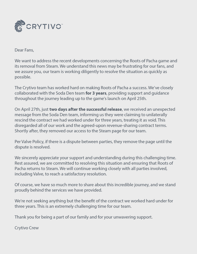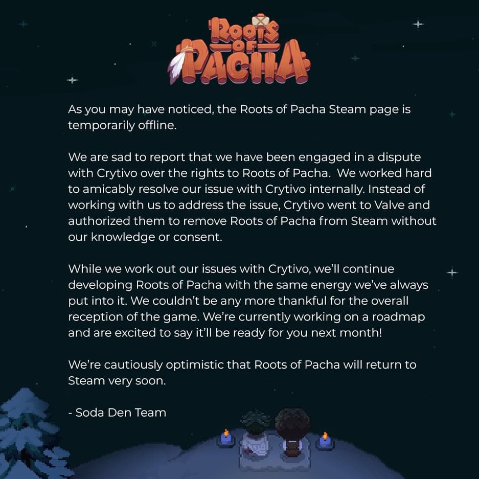 Soda Den рассказала о споре с Crytivo по поводу прав на игру Roots of Pacha, который они пытались решить внутренне. Утверждается, что вместо разрешения конфликта Crytivo решила обратиться к Valve, чтобы удалить Roots of Pacha из Steam без ведома и согласия разработчиков.