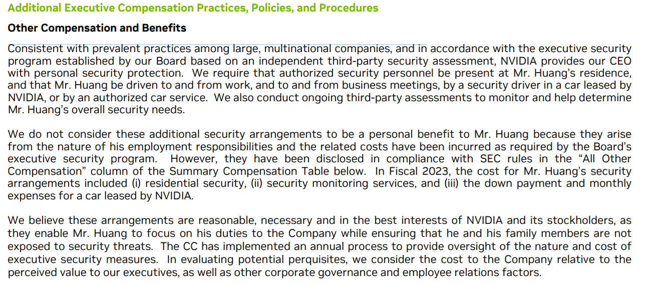Есть комментарий NVIDIA по поводу мер безопасности: надо, чтобы в резиденции Хуанга была охрана, а водитель службы безопасности отвозил его на/или с работы или на деловую встречу. В NVIDIA не считают эти дополнительные меры безопасности «личной выгодой» для Хуанга.