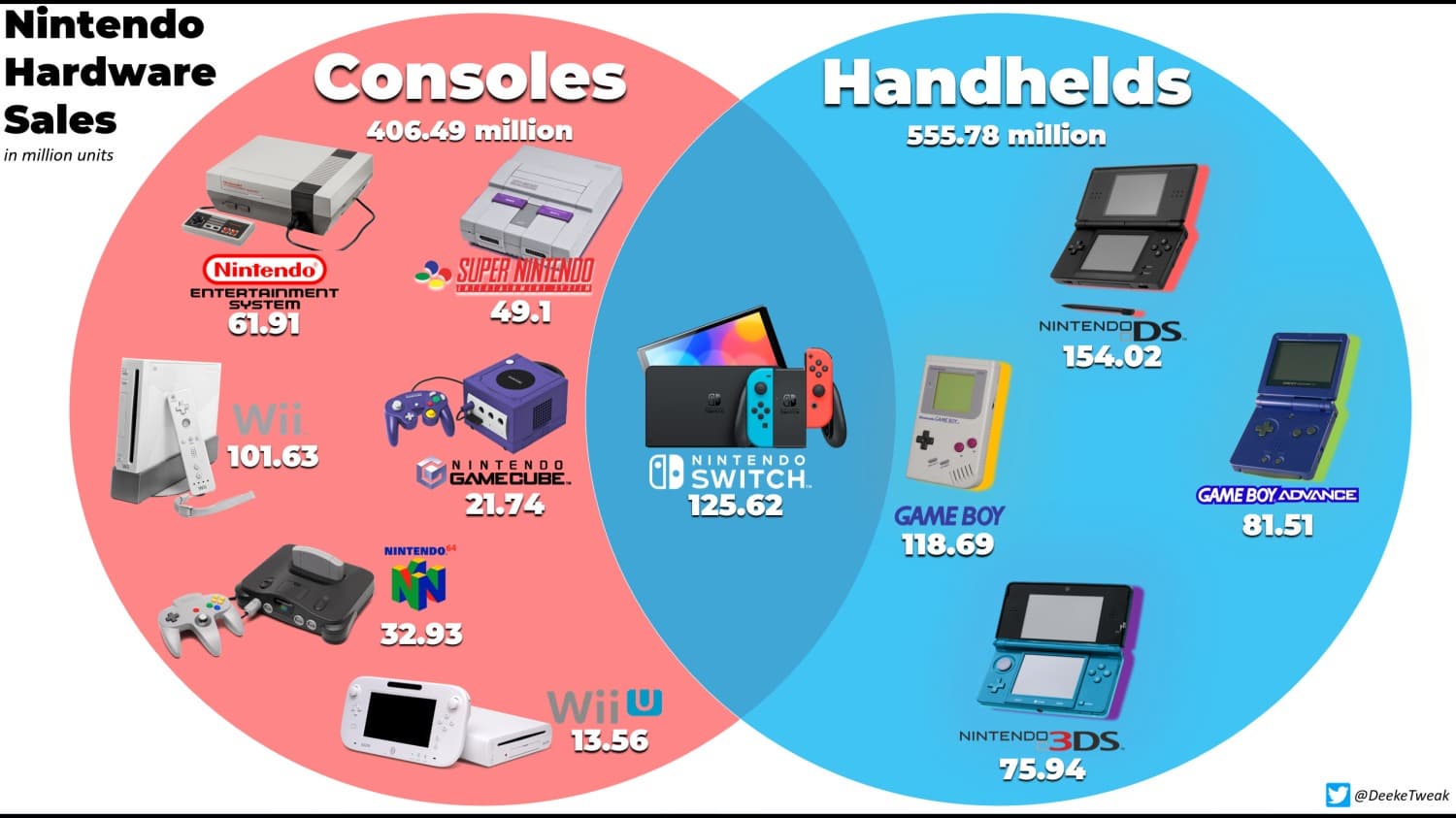Новые данные Nintendo показывают, что компания продала более 555 миллионов портативных консолей и более 406 миллионов домашних консолей. Switch технически и то и другое.