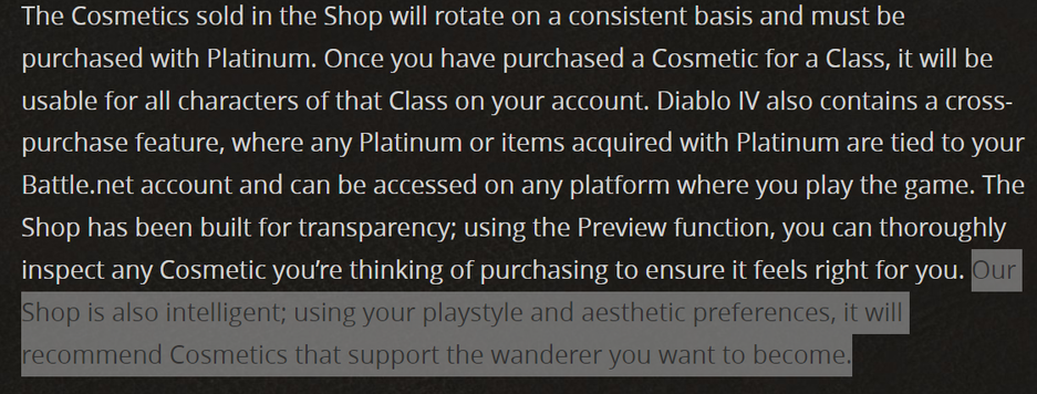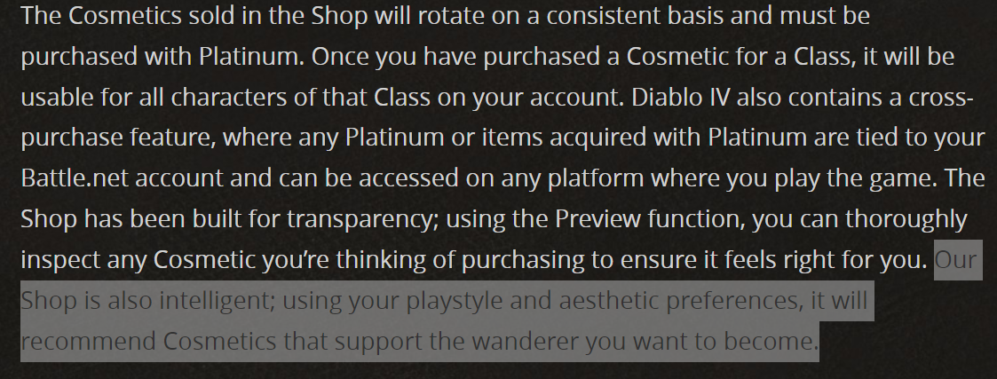 «Наш магазин также является "разумным"; используя [информацию про] ваш стиль игры и эстетические предпочтения, он будет рекомендовать косметику, которая поможет вам стать тем странником, которым вы хотите стать».