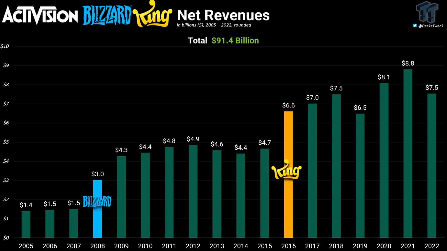 Исторические доходы Activision Blizzard King за период с 2005 по 2023 год, который совпадает с выходом Call of Duty 2, говорят, что компании заработали более 91 миллиарда долларов чистой прибыли.