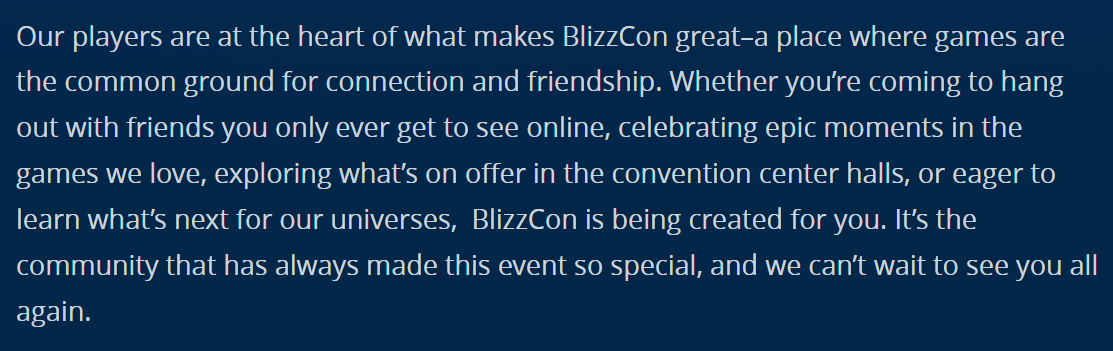 BlizzCon в 2019 году проводили в офлайн-формате, затем наступила пандемия и в 2020 его отменили. В 2021 мероприятие переехало в онлайн, в 2022 году не проводили.