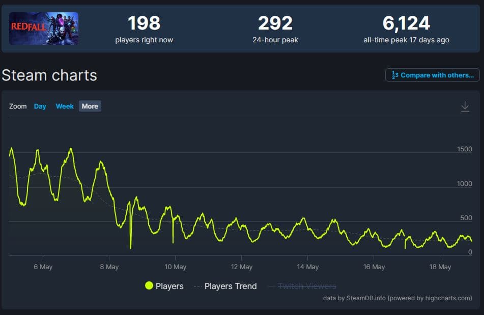 Важно отметить, что это показатели версии для персональных компьютеров. Не исключено, что у Redfall на консолях Xbox Series X|S дела обстоят лучше, ведь она доступна подписчикам сервиса Xbox Game Pass, но проверить это не представляется возможным, поскольку Xbox не делится подобной статистикой.