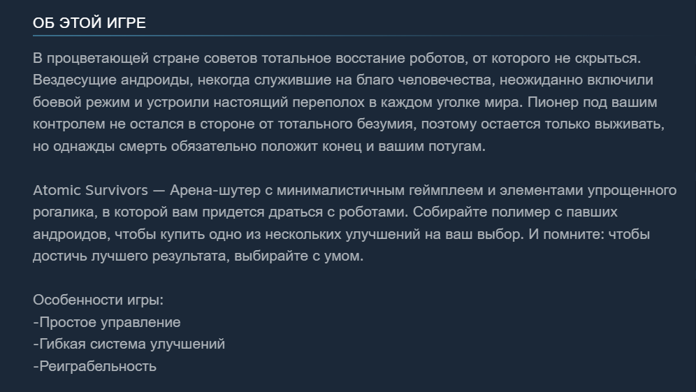 Недавно в Steam тихо вышла Atomic Survivors. С точки зрения игрового процесса это клон Vampire Survivors, а выделяется он в основном стилизацией под Atomic Heart.