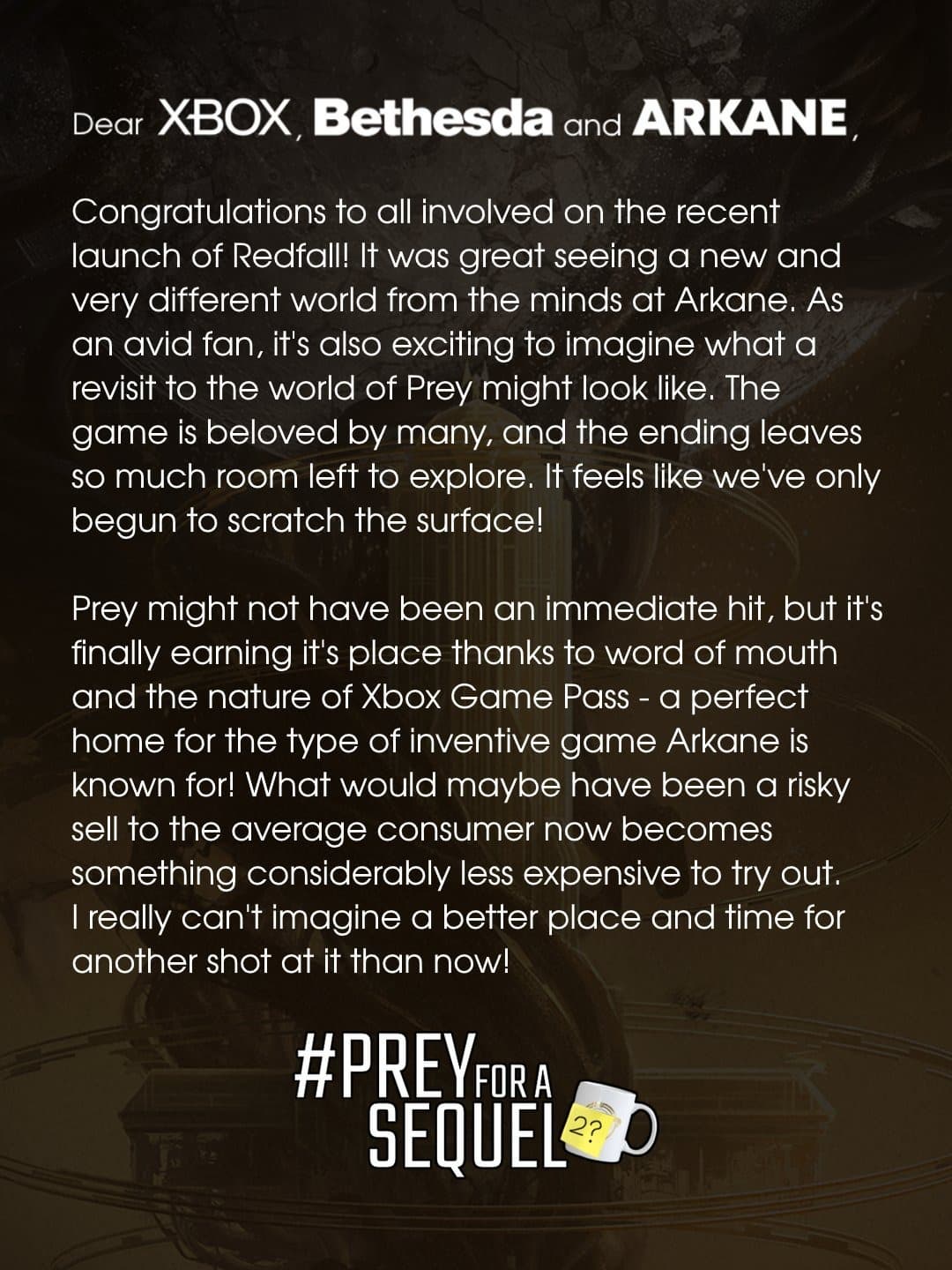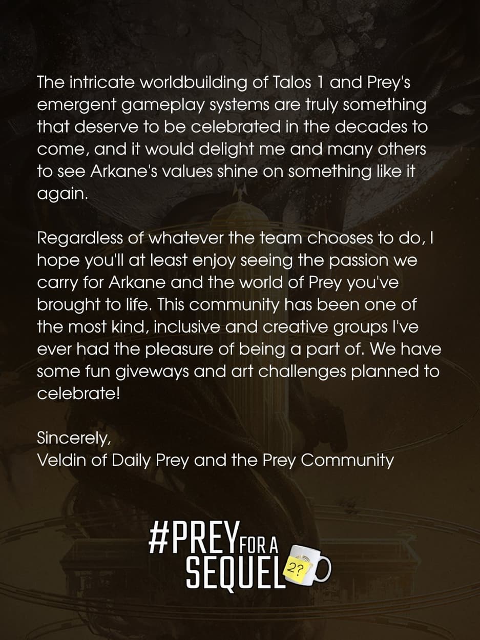 Письмо помечено хэштегом #PreyForASequel и отправлено через социальные сети на официальные аккаунты Bethesda, Arkane и Xbox. В письме говорится: