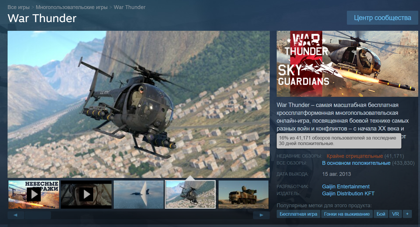 Сообщество War Thunder продолжает полыхать. Рейтинг игры в Steam опускается всё ниже, а особо активные персоны начали атаковать игру даже в поисковике