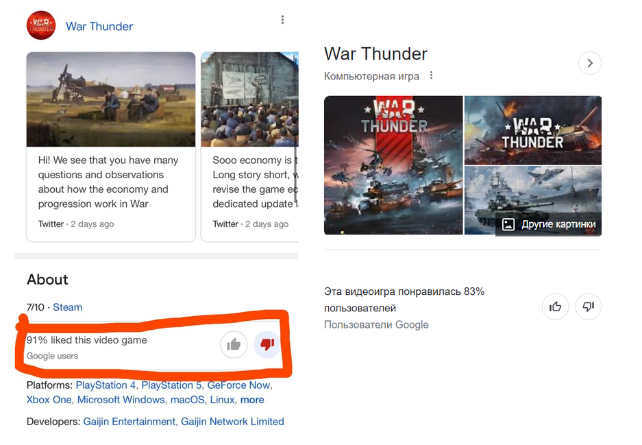 Некоторые начали ставить дизлайки War Thunder даже в Google, сейчас в поисковике у игры рейтинг 83% (недавно было более 90%).