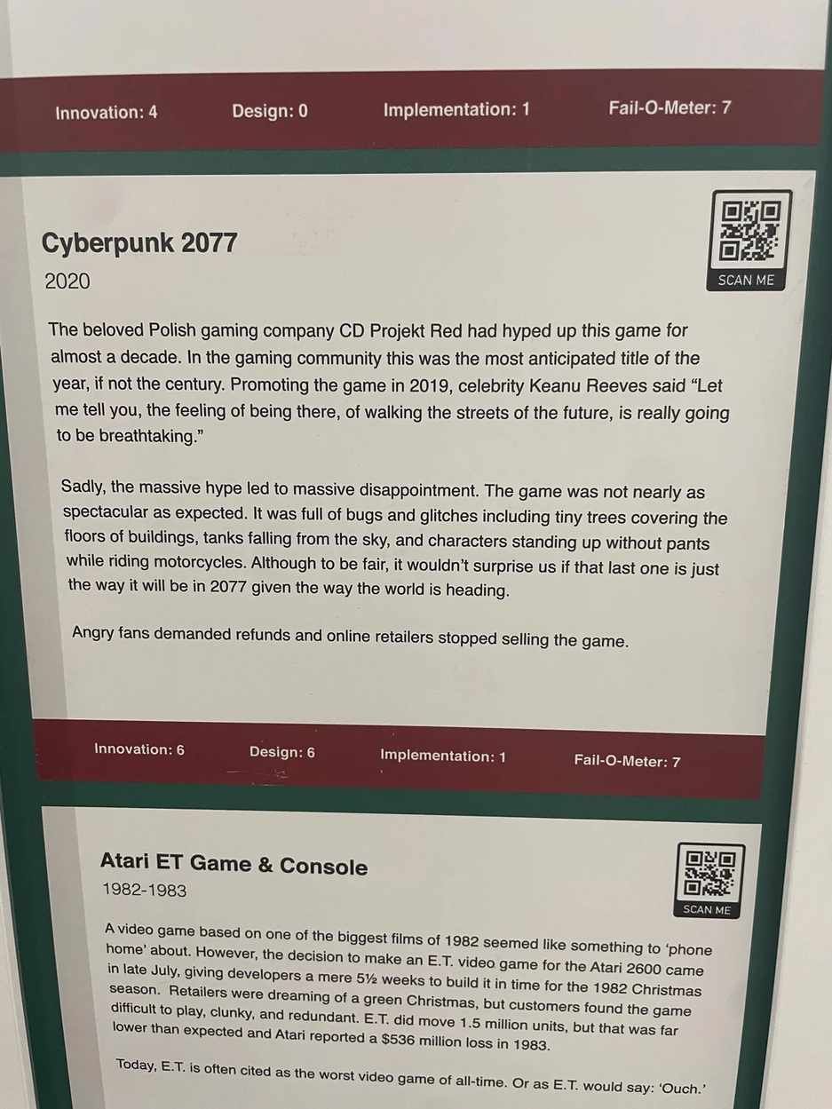 Музей провалов (Museum of Failure) это выставка, где экспонатами выступают провалившиеся бизнес-продукты. p4ul1023 посетил музей в Бруклине (Нью-Йорк) и заметил там Cyberpunk 2077.