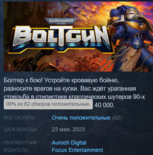 Warhammer 40,000 Boltgun стартует в Steam с 98% положительных отзывов. Геймеры очень положительно отзываются о новинке. На момент публикации онлайн превышает 7 тысяч игроков.