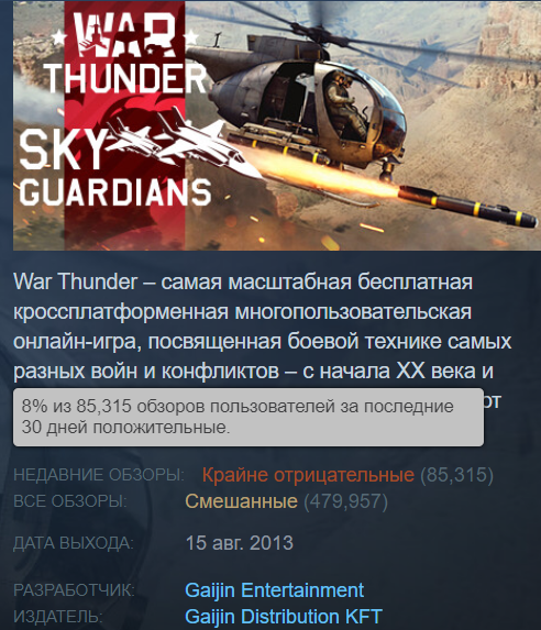 За последние 30 дней War Thunder получила более 85 тысяч отзывов, из которых 92% отрицательные. Общий рейтинг уже стал смешанным, хотя буквально пару дней назад был в положительной зоне.