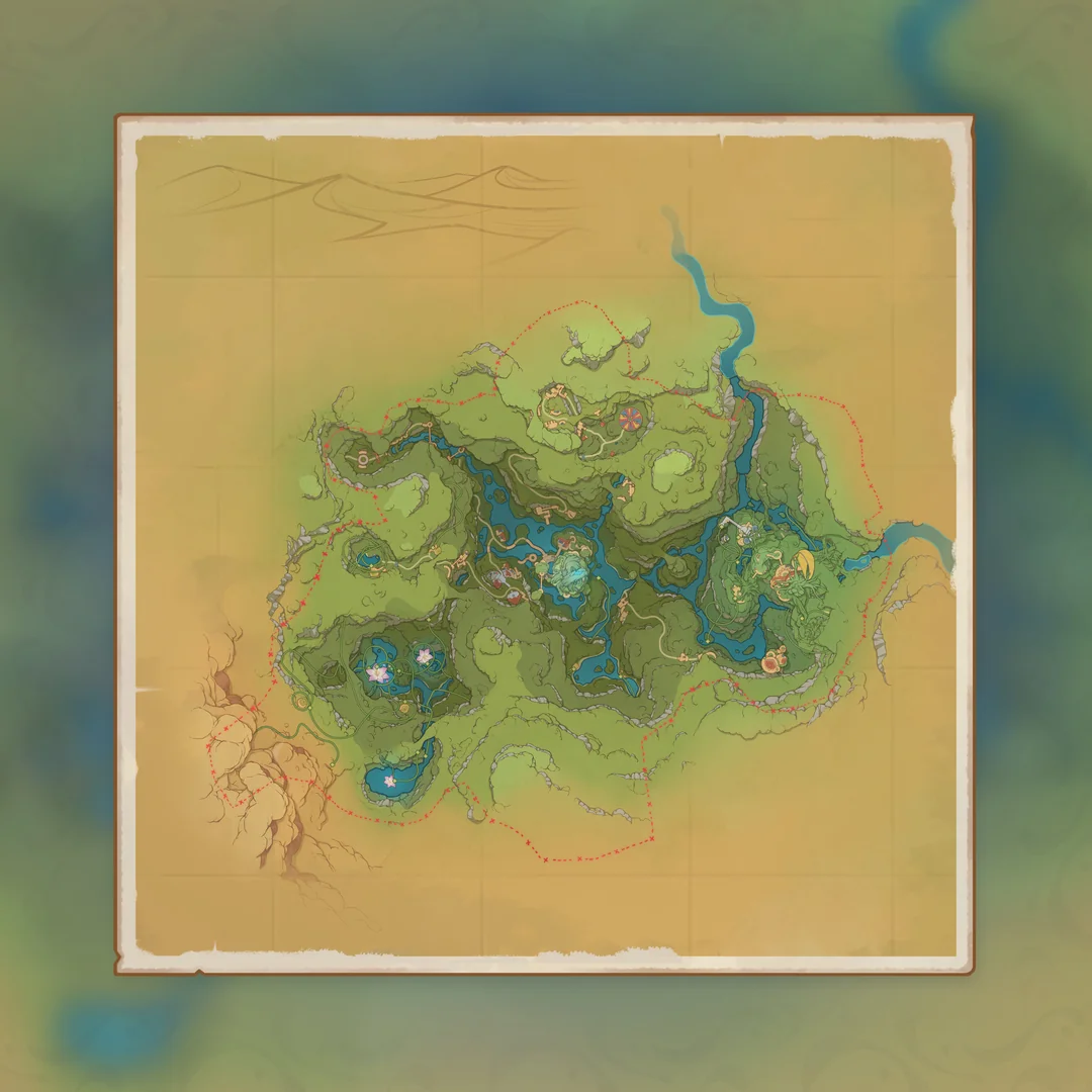 Не похоже, что эта локация является островом. В нижней части можно заметить нечто напоминающее пустынную область (есть мнение, что эта локация расположится недалеко от Сумеру).