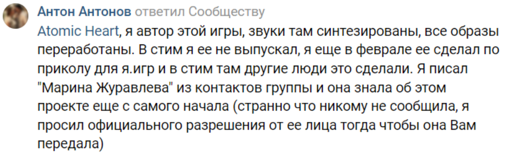 «я автор этой игры, звуки там синтезированы, все образы переработаны. В стим я ее не выпускал, я еще в феврале ее сделал по приколу для [яндекс.игры] и в стим там другие люди это сделали. Я писал "Марина Журавлева" [менеджер сообщества] из контактов группы и она знала об этом проекте еще с самого начала (странно что никому не сообщила, я просил официального разрешения от ее лица тогда чтобы она Вам передала)».